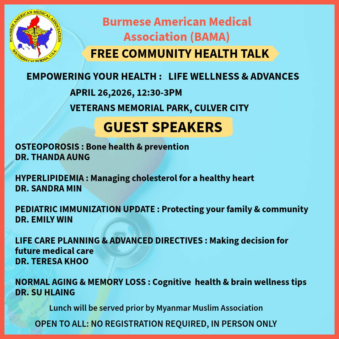 In collaboration with the Burmese Welfare Association and the Los Angeles Burmese Muslim community, the Burmese American Medical Association of Southern California hosted a complimentary community health seminar at Veterans Memorial Park in Culver City, California, on April 26, 2026.